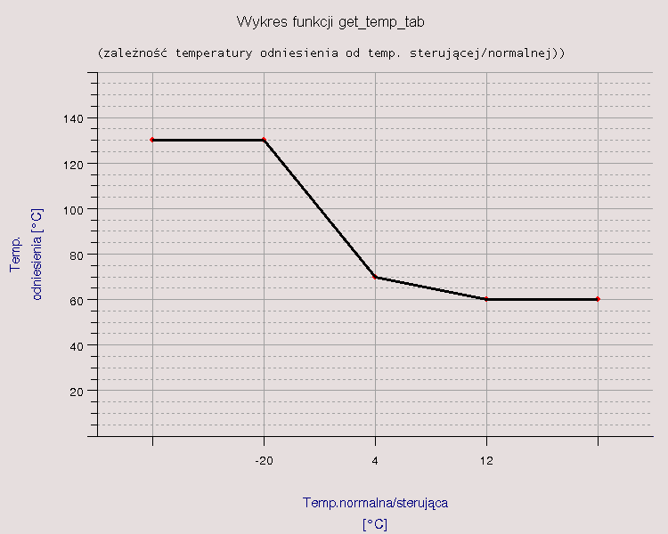 gdzie Tste - temperatura sterująca, Tnor - temperatura normalna, Tod_kor - programowalna na funkcji 93 korekta, a get_temp_tab() - funkcja wyliczająca temperaturę odniesienia w oparciu o łamaną przechodzącą przez następujące punkty charakterystyczne:
