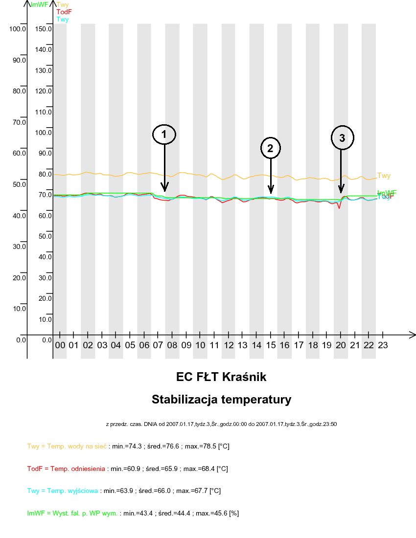 W punkcie 1 zaznaczono, gdy aktualna wartość temperatury odpływu (wartość wyświetlana na wyświetlaczu stałym) jest większa od wartości odniesienia (funkcja 00). W tym przypadku następuje zmniejszenie wysterowania falownika pompy wymiennika (funkcja 06). W punkcie 2 zaznaczono, gdy aktualna wartość temperatury odpływu (wartość wyświetlana na wyświetlaczu stałym) jest równa wartości odniesienia (funkcja 00) z tolerancją +/- 1°C. W tym przypadku falownik pompy wymiennika (funkcja 06) nie zmienia swojego wysterowania. W punkcie 3 zaznaczono, gdy aktualna wartość temperatury odpływu (wartość wyświetlana na wyświetlaczu stałym) jest mniejsza od wartości odniesienia (funkcja 00). W tym przypadku następuje zwiększenie wysterowania falownika pompy wymiennika (funkcja 06).