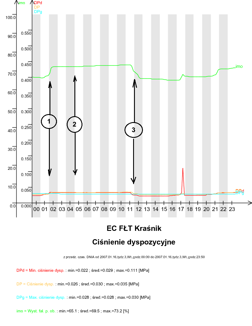 W punkcie 1 zaznaczono, gdy aktualne ciśnienie dyspozycyjne (funkcja 12) jest mniejsze niż dolna granica widełek dyspozycji (funkcja 11), co powoduje zwiększenie wysterowania pompy obiegowej (funkcja 02). W punkcie 2 zaznaczono, gdy aktualne ciśnienie dyspozycyjne (funkcja 12) znajduje się w widełkach. W tym przypadku pompa obiegowa (funkcja 02) nie podejmuje żadnych ruchów. W punkcie 3 zaznaczono, gdy aktualna wartość ciśnienia dyspozycyjnego (funkcja 12) jest większa od górnych widełek dyspozycji, co powoduje zmniejszenie wysterowania pompy obiegowej (funkcja 02).