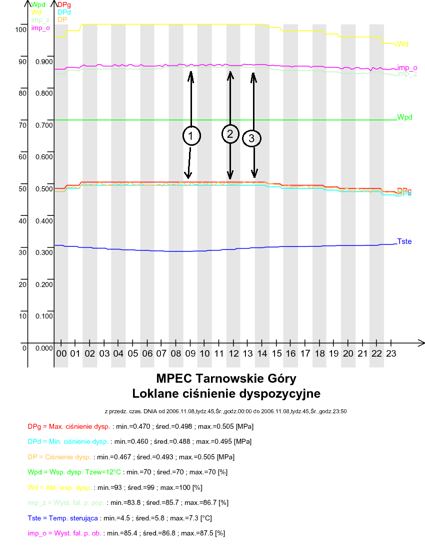 W punkcie 1 zaznaczono, gdy aktualne ciśnienie dyspozycyjne mierzone na przepompowni jest mniejsze niż dolna granica widełek dyspozycji, co powoduje zwiększenie wysterowania pompy poprzecznej. W punkcie zaznaczono, gdy aktualna wartość ciśnienia dyspozycyjnego jest większa od górnych widełek dyspozycji, co powoduje zmniejszenie wysterowania pompy: poprzecznej W punkcie 3 zaznaczono, gdy ciśnienie dyspozycyjne znajduje się w widełkach. W tym przypadku pompa: poprzeczna nie podejmuje żadnych ruchów.