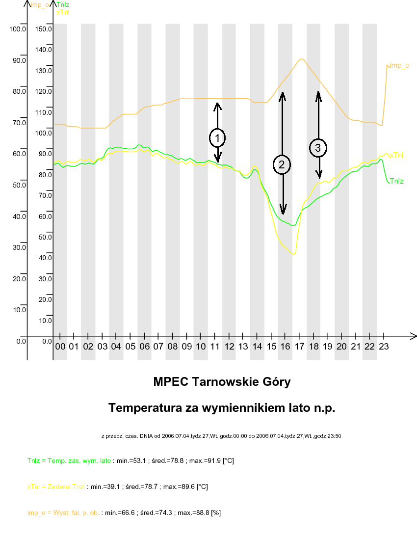 W punkcie 1 zaznaczono sytuację, gdy wartość aktualna wartość temperatury za wymiennikiem lato n.p. (pomiar w regulatorze nadrzędnym) jest równa z tolerancją +/- 2°C wartości zadanej. W tym przypadku pompa obiegowa nie zmienia swojego wysterowania. W punkcie 2 zaznaczono sytuację, gdy aktualna wartość temperatury za wymiennikiem lato n.p. (pomiar w regulatorze nadrzędnym) jest wyraźnie większa od wartości zadanej. W tym przypadku następuje zwiększenie wysterowanie pompy obiegowej. W punkcie 3 zaznaczono sytuację, gdy aktualna wartość temperatury za wymiennikiem lato n.p. (pomiar w regulatorze nadrzędnym) jest wyraźnie mniejsza od wartości zadanej. W tym przypadku następuje zmniejszenie wysterowanie pompy obiegowej (funkcja 04).